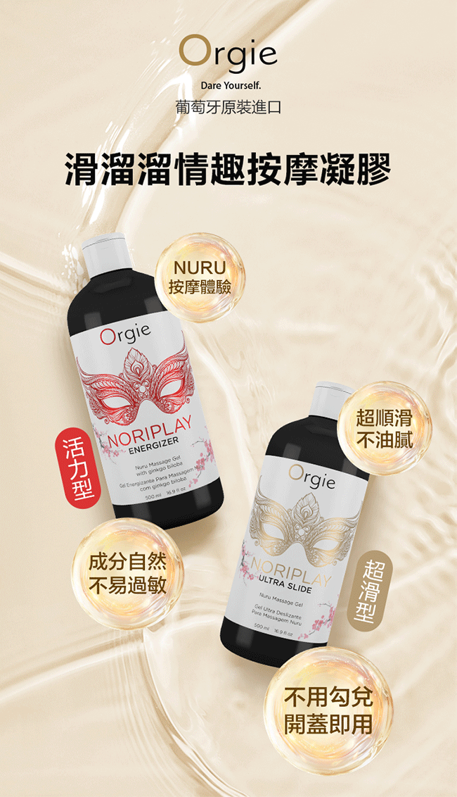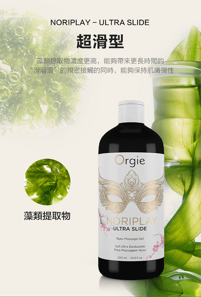 Noriplay按摩gel採用海藻提取物、銀杏及人參配製而成,其質感非常滑溜,作為身體按摩或乳交非常適合,通過銀杏和人參的活力特性,增強身體對身體的 Nuru 按摩。