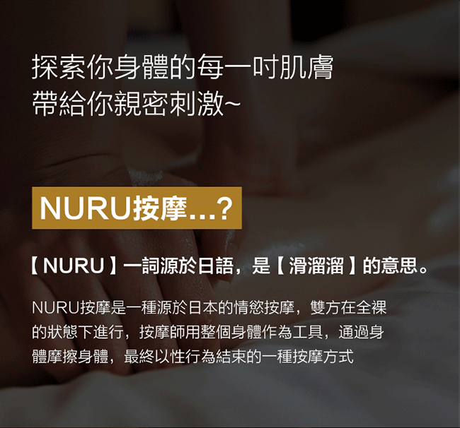 Nuru是日文滑的意思,亦是日本著名的按摩秘訣,就是以自己的身體作為按摩的工具,以自己極滑身體給對方強烈的按摩接觸感覺。